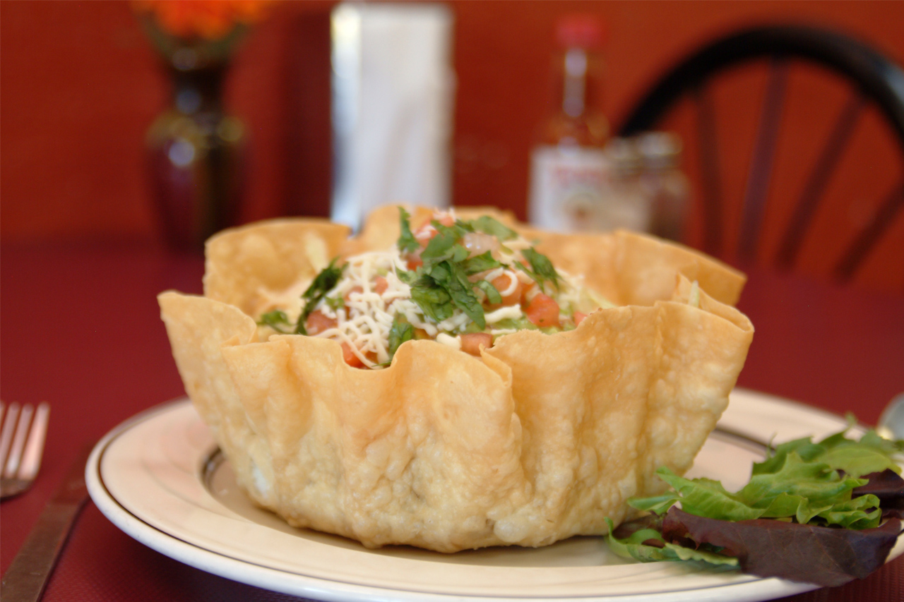 Taco Salad: Meat, Beans, Rice, Lettuce, Sour Cream, Guacamole, Salsa & Cheese