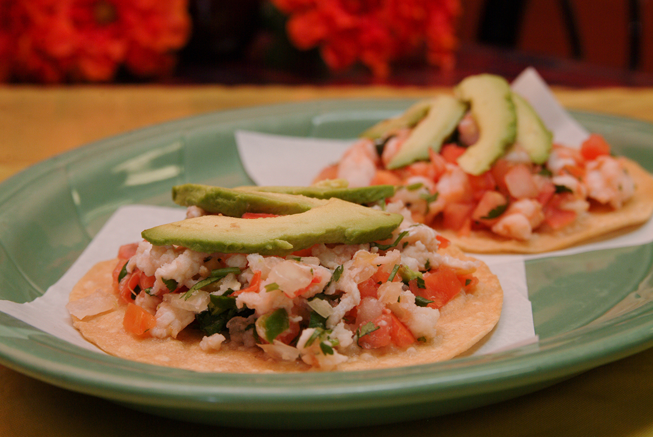 Tostadas de Ceviche: Fish or Shrimp includes Avocado Slices