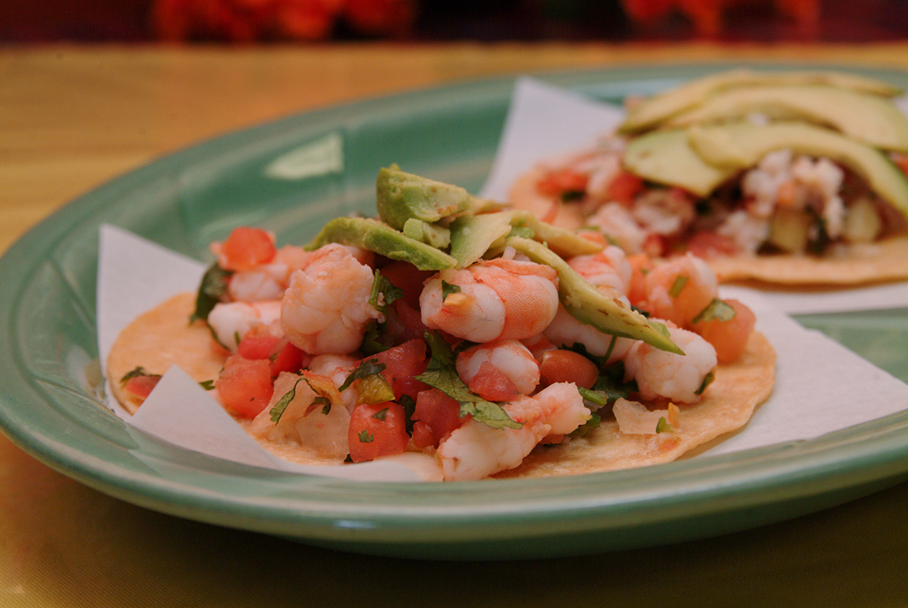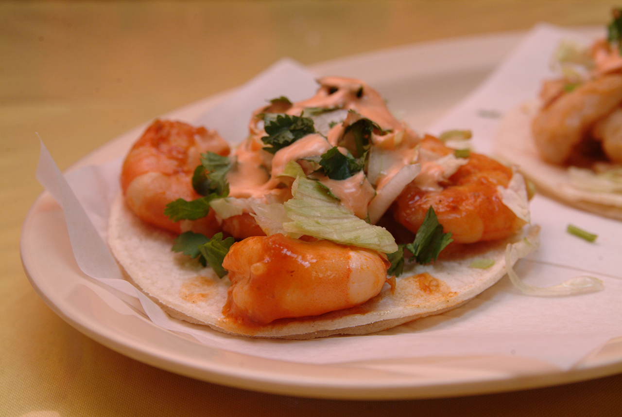 Marisco Tacos: Grilled Fish or Grilled Shrimp on a Double Corn Tortilla, Lettuce, Onions,Cilantro, & Seafood Sauce